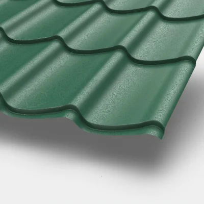 Лучшим выбором будет использовать металлочерепицу в покрытии полиуретан (к этому классу покрытий относится Пурал, Пурман, Quarzit, Пуретан и др.), толщина покрытия от 35 до 50 мкм.