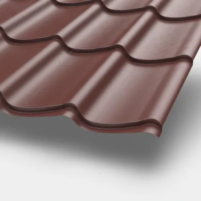 Лучшим выбором будет использовать металлочерепицу в покрытии полиуретан (к этому классу покрытий относится Пурал, Пурман, Quarzit, Пуретан и др.), толщина покрытия от 35 до 50 мкм.