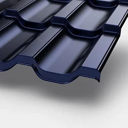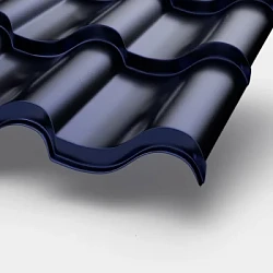 Металлочерепица «Металл Профиль» темно-синий — популярный оттенок для кровли жилых домов и коммерческих зданий. Доступен во всех профилях линейки: от классической Ламонтерры до выразительной Монтерросы.