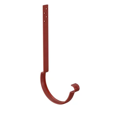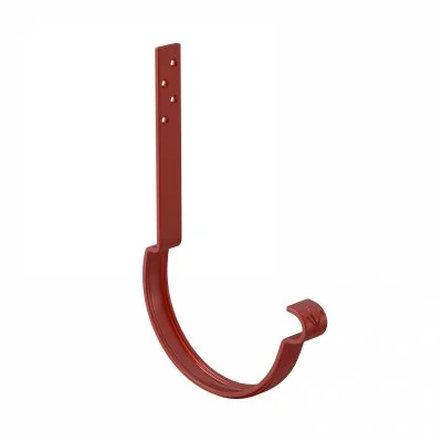 Если кровля из металлочерепицы, то рекомендуем поднять нижние ряды металлочерепицы и установить жёлоб на длинных крюках к стропилам. Это надёжнее. Но есть также держатели, которые крепятся на лобовую доску.